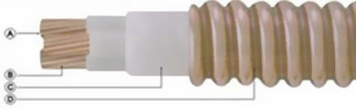 A.導(dǎo)體:絞合銅導(dǎo)體;B.絕緣:組成云母帶;C.填充:無機資料;D.銅套:縱包焊接并軋紋